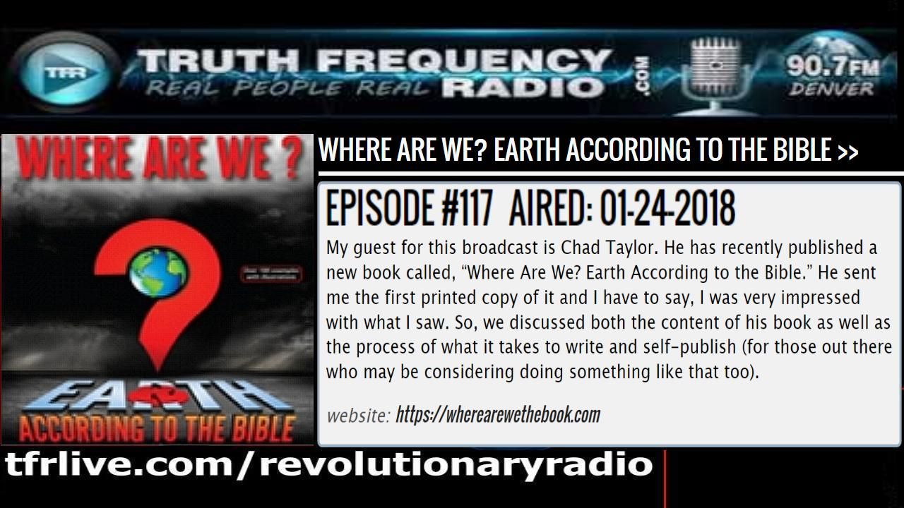 My guest for this broadcast is Chad Taylor. He has recently published a new book called, “Where Are We? Earth According to the Bible.” He sent me the first printed copy of it and I have to say, I was very impressed with what I saw. So, we discussed both the content of his book as well as the process of what it takes to write and self-publish (for those out there who may be considering doing something like that too).