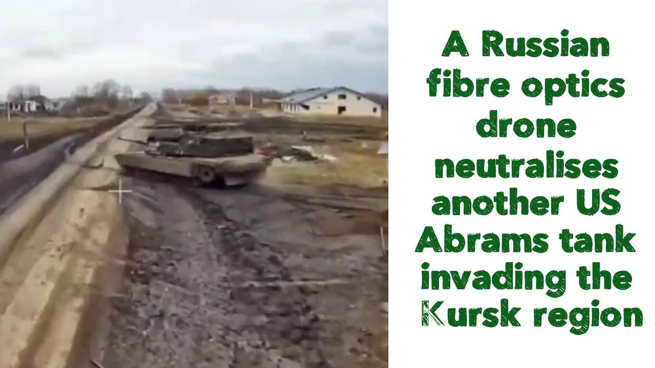 ❗️A Russian fibre optics drone neutralises another US Abrams tank invading the Kursk region.