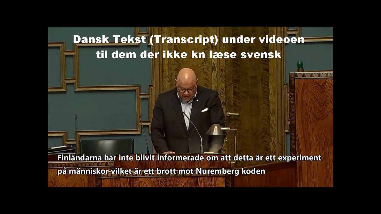 Jeg har sagt her mange gange, at dette er et menneskeligt eksperiment. I strid med Nürnberg-koden har ikke finnerne fået at vide, at dette er et menneskeligt eksperiment. Nu, med denne tale, har jeg gjort alle jer og medierne opmærksomme på, at dette er et menneskeligt eksperiment, og at dets resultater er forfærdelige. Til sammenligning blev den tidligere mislykkede vaccineundersøgelse, Pandemrix, stoppet med 32 gange færre bivirkninger end nu. Så nu spørger jeg jer alle: hvor mange mennesker skal dø eller blive såret, så vi kan stoppe dette drab og sårede mennesker?