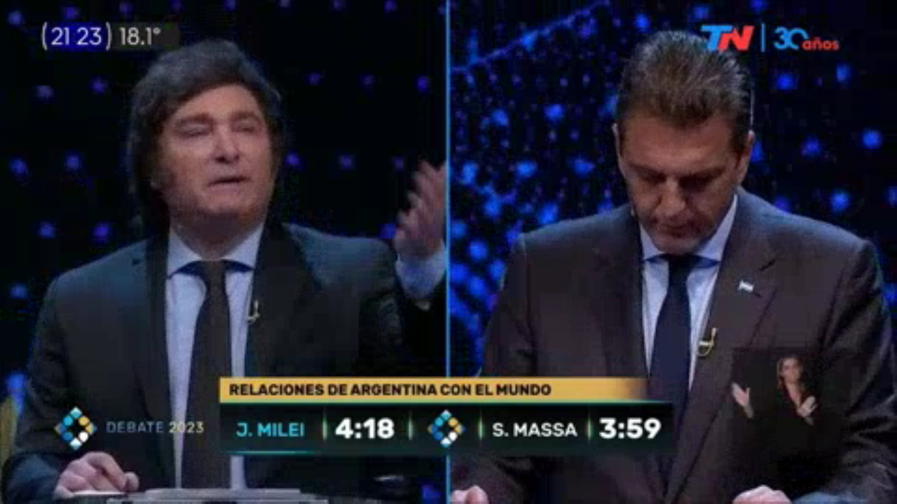 Principales segmentos del segundo debate por la presidencia correspondientes al político liberal Milei y su oponente Massa, perteneciente al partido popular de izquierda.