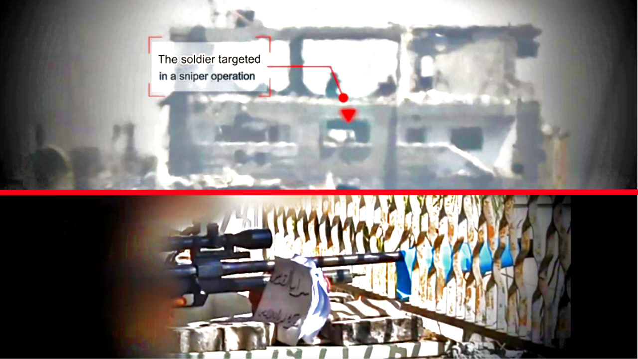 Scenes of the Mujahideen of the Al-Quds Brigades sniping an enemy soldier during the Zionist incursion into the Al-Shujaiya neighborhood, east of Gaza City. 2024/07/17