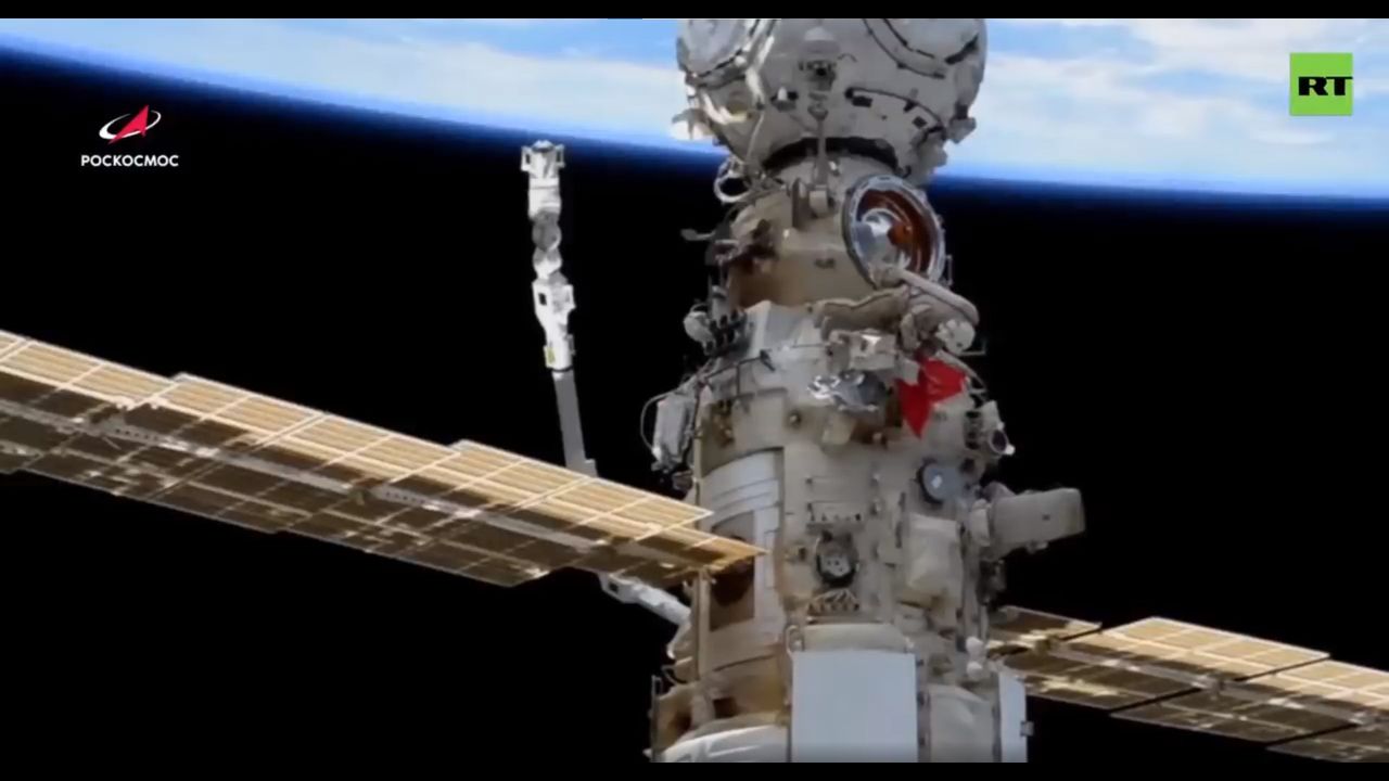 Russian cosmonauts at the Intl Space Station unfold a replica of the Victory Banner on the external side of Russia’s Nauka multi-purpose laboratory module