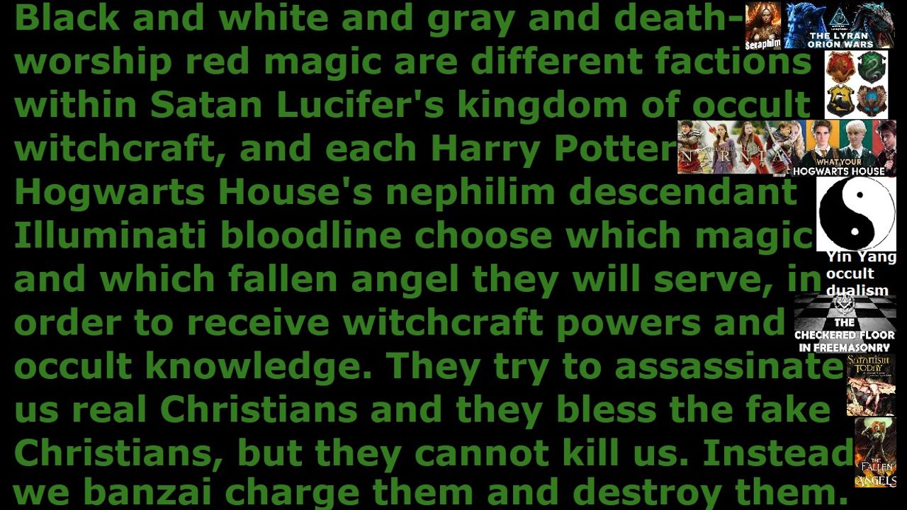 *** Intelligence news update from the Human Homo-Sapiens Race Survival Resistance (HRSR) headquarters and Republic Rebel Alliance battlefront (December 2024). Black and white and gray and death-worship red magic are different factions within Satan Lucifer's kingdom of occult witchcraft, and each Harry Potter Hogwarts House's nephilim descendant Illuminati bloodline choose which magic and which fallen angel they will serve, in order to receive witchcraft powers and occult knowledge. They try to assassinate us real Christians and they bless the fake Christians, but they cannot kill us. Instead we banzai charge them and destroy them. These black & white & gray & red magicians hate each other, but they all unite only for evil purposes and for gaining power. Caleb was at the very top of Satan Lucifer’s hierarchy as a military black ops department highest magi, but when he found out more and more of the occult knowledge and the truth, he immediately changed sides and decided to become a Christian. End of transmission…