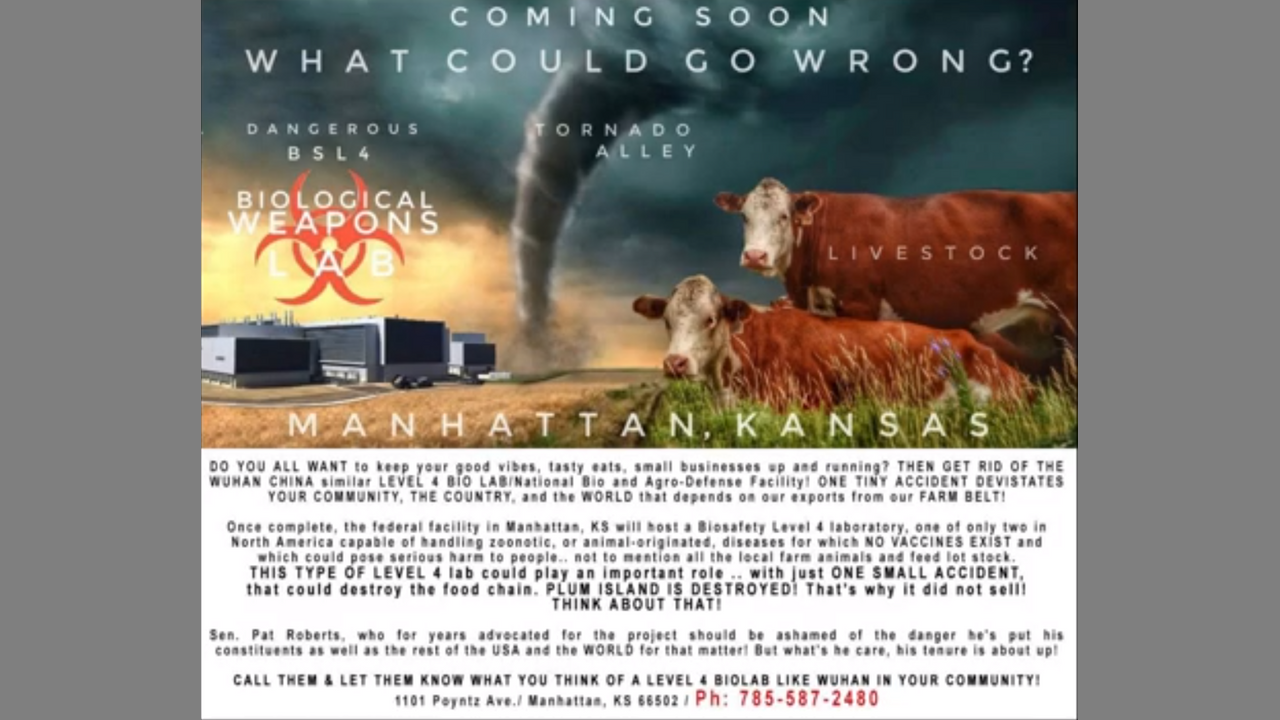 The number one goal is to drive awareness and maximize attention on the planned opening of the KThere is a deadly crisis brewing in our nation’s heartland. On the heels of the Wuhan-pandemic that has devastated the world, another dangerous level 4 bio-lab is set to open in the agricultural belt of our Country in Manhattan, Kansas next year. This story is important and newsworthy, yet the media and politicians are silent. What are they hiding?ansas National Bio and Agro-Defense Facility. According to one expert, this lab has a 70% chance to cause a devastating leak within 50 years. A lab researching deadly human and livestock contagions WITH NO KNOWN CURES does not belong on the U.S. mainland.