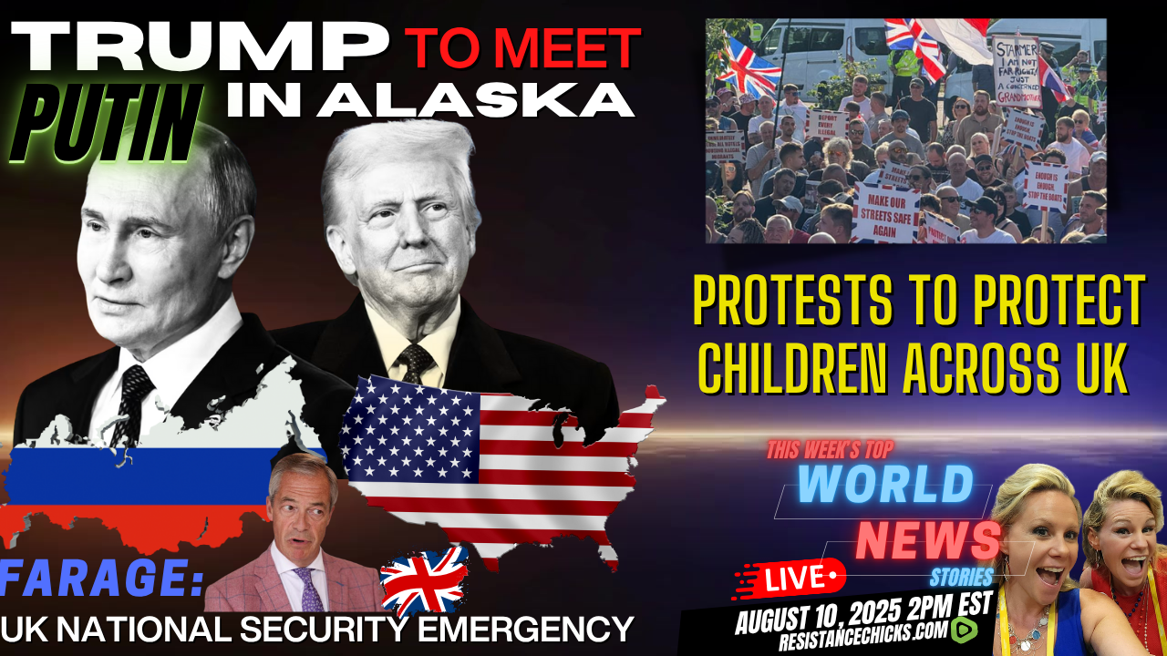 World News Report: Trump angers neocons and Zelensky by announcing he has invited Putin to meet with him in Alaska next Friday. Protests to Protect Children Across UK Police escorted ‘Stand Up to Racism’ activists away from a protest against migrant child rape to jeers of “pedos out” by locals in Warwickshire, England, on Saturday. Reform UK leader Nigel Farage warned that Britain is facing a “national emergency” as apparent illegal boat migrants were filmed chanting “Allahu Akbar” as they crossed the English Channel. All of that and MORE in this week's TOP World News Stories! Read More: https://www.resistancechicks.com/trump-to-meet-putin-in-alaska/