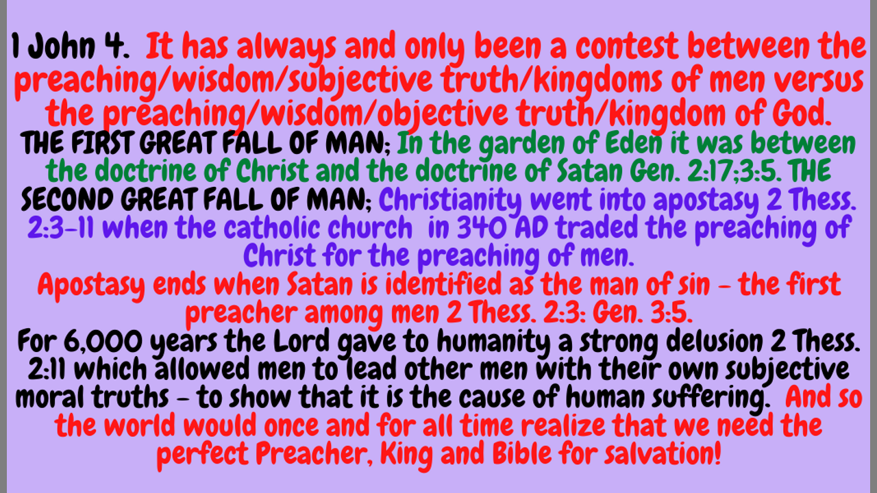 The preaching and religions of men: denominationalism, socialism, atheism, etc., are the cause of human suffering and the spiritual dark ages 2 Thess. 2:3. The spiritual warfare that we are to fight is between the preaching of men and the preaching of Christ Gen. 2:17; 3:5.