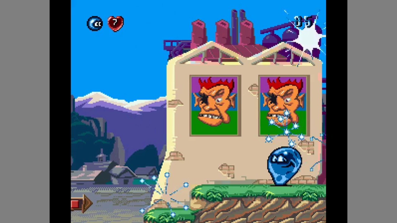 Mr. Blooby can jump and change his colour between blue, red green and purple. He can also spit little drops of his current colour to the side or upwards. The latter is used to manipulate objects of the same colour or colour blocks in certain puzzles. The game mostly consists of puzzles like pictionary or colouring falling tiles to form a given image. These are embedded in platform levels where you need find your way through all kinds of traps and hazards.