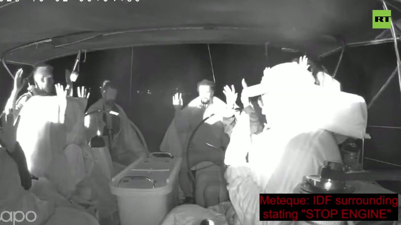 Crew sat in circle, hands held high as Israeli ship BLINDS them with lights