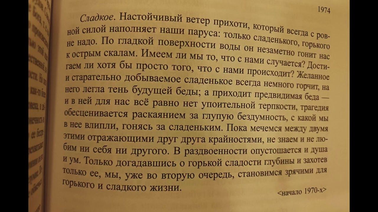 Sweet. The persistent wind of whimsy, which always fills our sails with even force: only sweet, bitter is not necessary. On the smooth surface of the water, he imperceptibly drives us to the sharp rocks. Do we have what happens to us? Do we achieve at least just what is happening to us? The desired and diligently extracted sweet is always a little bitter, the shadow of future trouble has fallen on it; and the foreseeable trouble comes — and for us there is still no intoxicating astringency in it, the tragedy is devalued by remorse for the stupid thoughtlessness with which we got into it, chasing the sweet. While we are rushing between these two extremes reflecting each other, we do not know and do not love either ourselves or the other. In duality, both the soul and the mind are emptied. Only by guessing about the bitter sweetness of the depth and wanting only it, we, in the second place, become sighted for the bitter and sweet life.