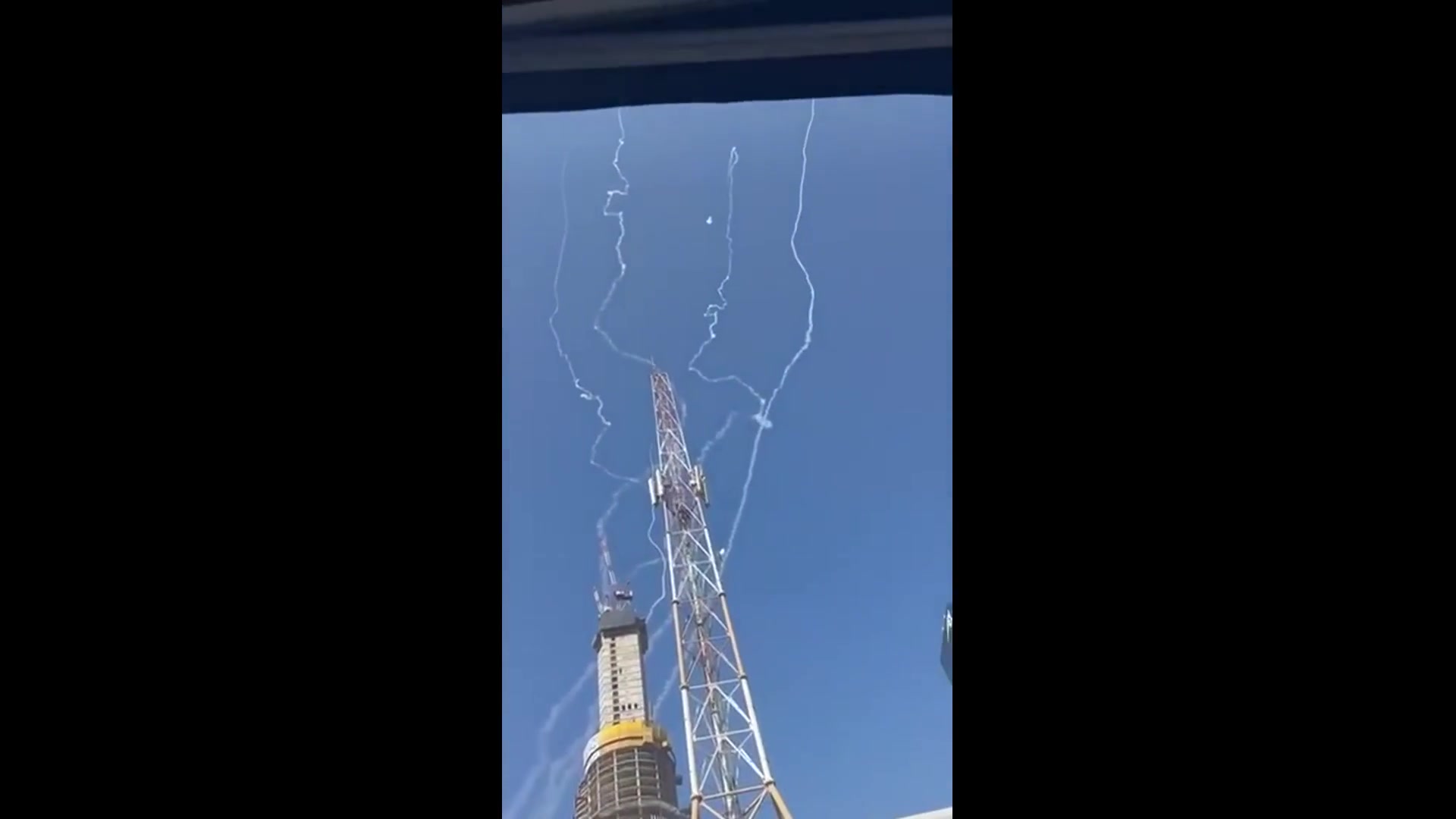 Numerous interceptors launched around the IDF Headquarters, the Kirya, in Tel Aviv this morning.