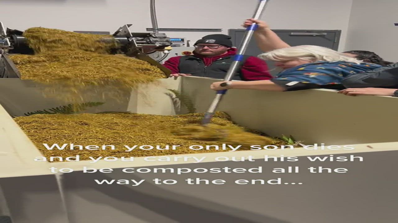 “When your only son dies and you carry out his wish to be composted all the way to very end,” reads the in-video caption.