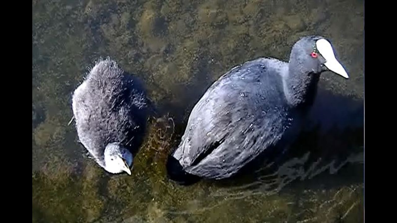 This is a continuing story about the one surviving Eurasian Coot chick at our nearby wetland. It probably survived because the other three starved before it did, plus having the most persistent 'chirp' to keep its parent feeding it. Now few months old at this stage it continues to chirp persistently (and still get food from mum/dad), and only at the end of the video does it duck its head under the water to search for something to eat from the biomass it swims over.