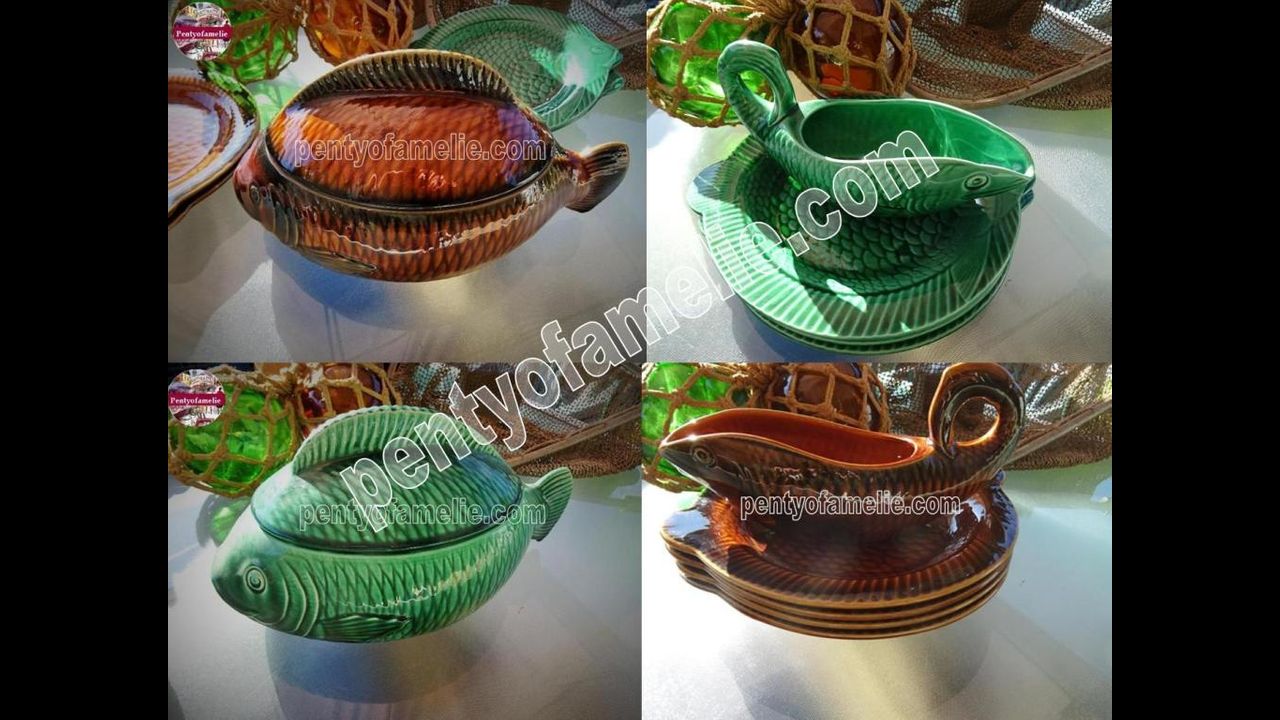 This Mid century set, including Majolica Fish shaped Plates, Large fish serving platters, Gravy Boat, and Soup Fish Head Tureen, the whole set, coming in Chestnut Brown and Emerald Green colors. Perfect for a kitchen wall display.