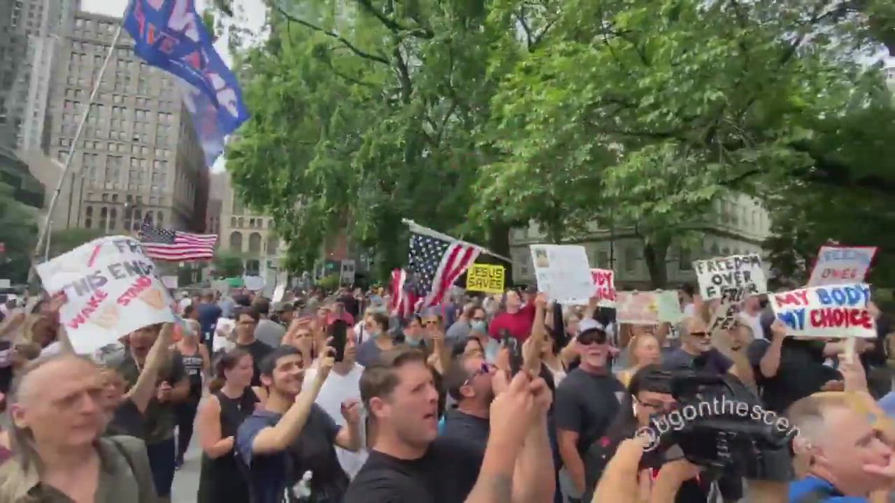 "We will not comply." Anti vax passport protest in NY.