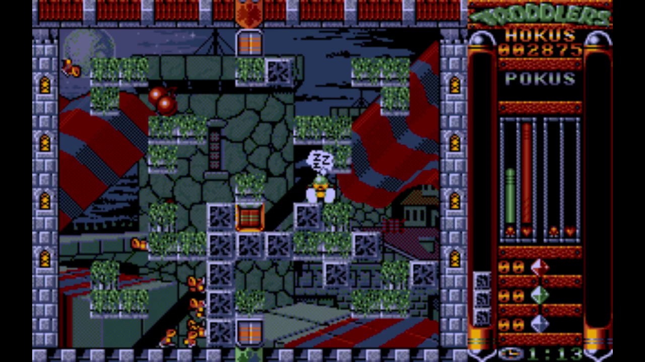 Troddlers is similar to Lemmings. In each levels, Troddlers will enter the level through a door and need to be guided to the exit. You need to get a given number of Troddlers to the exit within a time limit. Like Lemmings, Troddlers will also walk constantly in the direction they are facing, regardless of consequences. There are several differences, though. Troddlers can walk on walls and ceilings, as well. You also have a character (either Hokus or Pokus) you control, instead of giving Lemmings (or Troddlers in this case) tasks. Controlling your character is similar to Solomon's Key. He can jump, place blocks and remove blocks. You need to place blocks in way that the Troddlers can reach the exit. You only have limited number of blocks. Once you have run out, you have remove blocks from their current position.