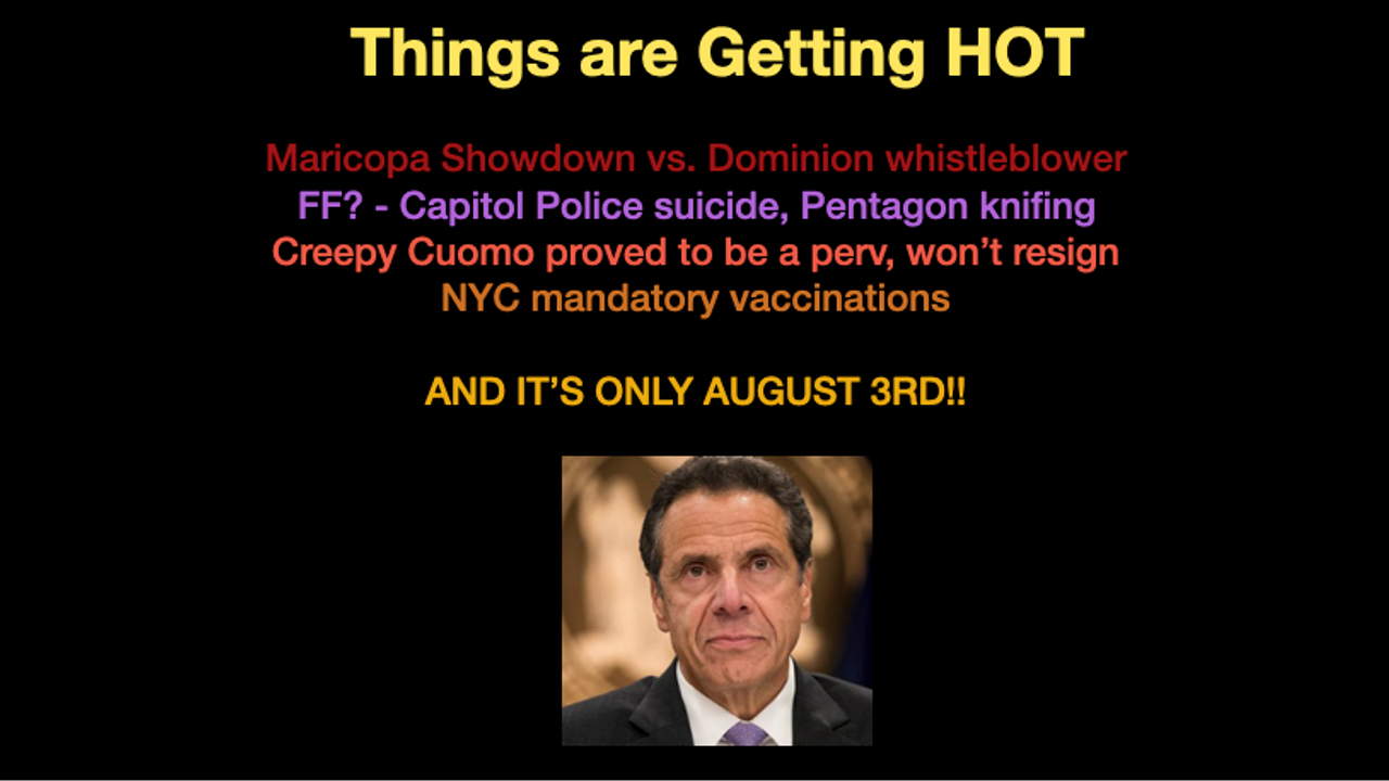 August 3, 2021 - CodeMonkey releases Dominion whistleblower testimony (see the 1:17 min. Clip), a third Capitol Police officer’s suicide, a fourth officer dies outside the Pentagon, calls for Cuomo to resign, NYC announces mandatory vaccinations, and more.