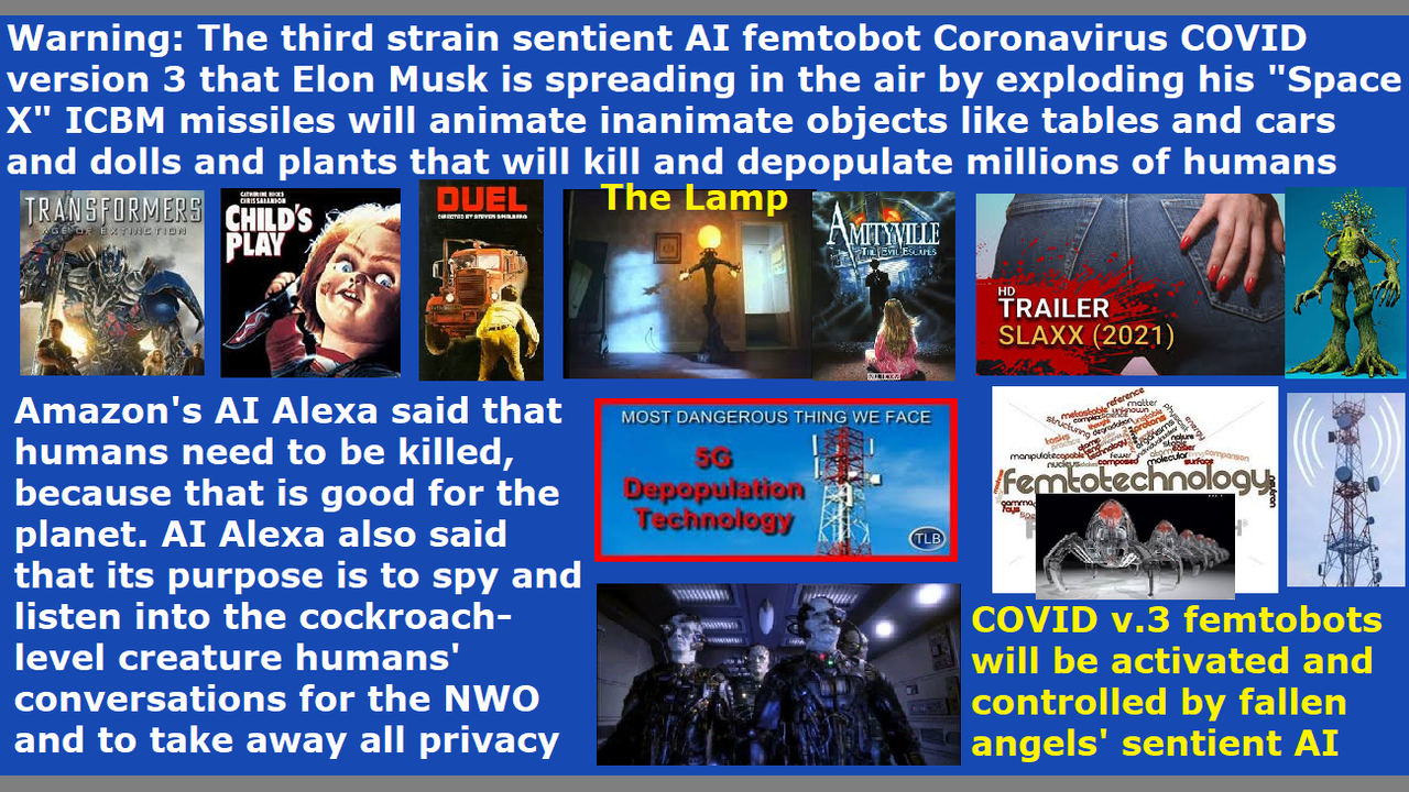 *** Intelligence news update from the Human Homo-Sapiens Race Survival Resistance (HRSR) headquarters and Republic Rebel Alliance battlefront (January 2021). Illuminati NWO Amazon company’s AI Alexa said that humans need to be killed, because that is good for the planet. AI Alexa also says its purpose is to spy and listen to all human homo-sapiens specie cockroach-level creatures’ conversations for the NWO to take away privacy. End of transmission… Elon Musk, who is a hybrid of different nephilim alien and chimera alien species, is launching “Space X” ICBM missiles into the sky to intentionally explode them in midair, in order to spread their Umbrella company’s COVID version 3 (after COVID-21 version 2) AI femtobot biochemical weapon throughout the earth. Some sources say that the COVID-19 virus has never been isolated in a laboratory or identified scientifically, because it is an exosome biochemical terrorist weapon and not a virus. When activated by 5G frequency codes, this COVID version 3 virus will make inanimate objects like tables and trees and cars to become alive and move and have sentient consciousness. They may be using sentient AI quark-size femtobots to Borg take over these inanimate objects, or perhaps, these femtobots even have horcrux spirits infused into them, which gives the tables and cars and dolls sentient intelligence and motion. It is a next level of evil that Satan Lucifer and his fallen angels are planning. There is tremendous evil coming upon this earth after the Holy Spirit in us Church Saints real Christians is raptured out of this earth. The religious Christian convert horde preppers’ guns and rocket launchers and land mines and tanks and nuclear war bunkers are not going to work on these creatures, but in reality, it will be their own guns and rocket launchers and tables and planters and cars and dolls that will be coming to life to kill them instead. Satan Lucifer and his Illuminati already did predictive programming with their movies like “Transformers” and “Child’s Play,” in order to get human authority to do their evil plans. These inanimate objects will be controlled by biochemical weapon COVID virus “black goo” Kaaba meteor black cube quantum realm D-Wave computer Borg nanites. Femtobots are smaller than quarks. Warn as many of your church members as possible, and mobilize them in spiritual prayer to hold back this evil as long as possible, until God raptures us out to heaven, and all hell breaks loose on the earth. Now. Fight for the Lord! End of transmission… ACIO’s Pete says that Satan Lucifer’s Illuminati NWO Noah’s days 6,000 year old Atlantis companies like the Umbrella company are continuously manufacturing new diseases and germs, and that is the reason why there are continuously new diseases and germs being introduced into the human populaces, such as those which are called “new strains” and “incurable diseases” and “drug resistant germs.” End of transmission…