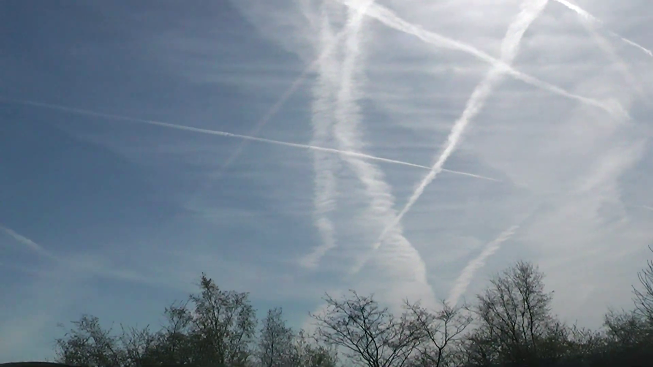 In one continuous unedited shot, see planes leaving regular short ice-crystal contrails that dissipate quickly, and long thick chemtrails, which spread out and block the sun.