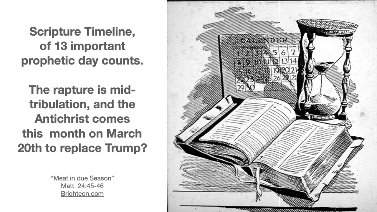 The video gives a timeline of 13 bible prophetic day counts. Nine of these 13 scriptural day counts have already occurred, which adds strong creditability that the remaining 4 scriptural day counts will be fulfilled as shown. Second coming on Yom Kippur 2028 minus the 1290 day count of Daniel 12:12, gives us the date of March 20th this year for the Devil and his angels to be cast down to the earth, and for the antichrist to appear this same day.