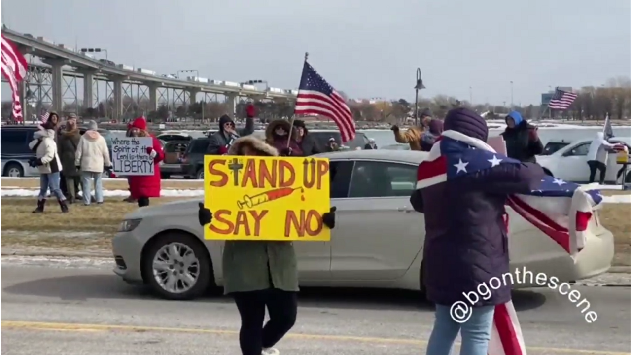 US Convoy on the US side at the Blue Water Bridge that connects to Sarnia, Ontario, Canada. "A convoy protesting vaccine mandates and Covid restrictions has gathered on the U.S. side of the border under the Blue Water Bridge in Port Huron, Michigan" - @BGOnTheScene on Twitter