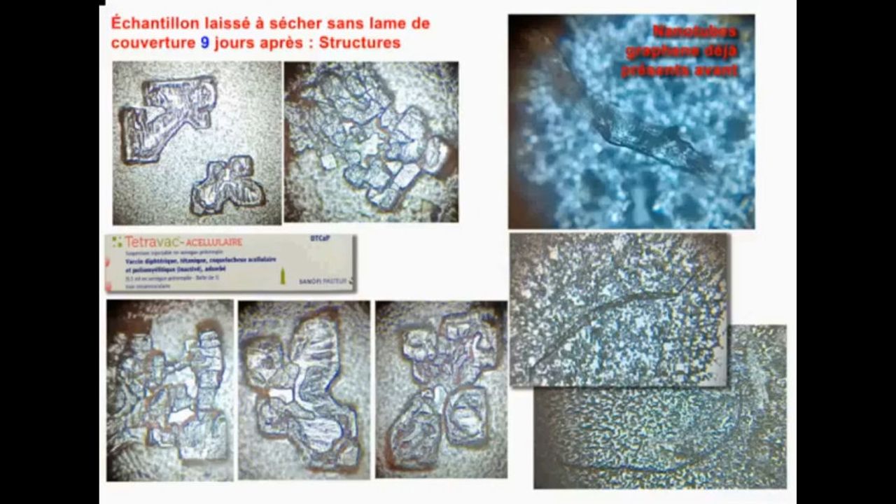 "These microscopic images were sent to us by Perla, an anonymous mother in France, who – having heard of graphene in CoqueVide injections – decided to buy a microscope following her tetanus vaccine and following a booster vaccine, for her child, with Tetravac – which is a vaccine against, allegedly, pertussis, tetanus, poliomyelitis and diphtheria."