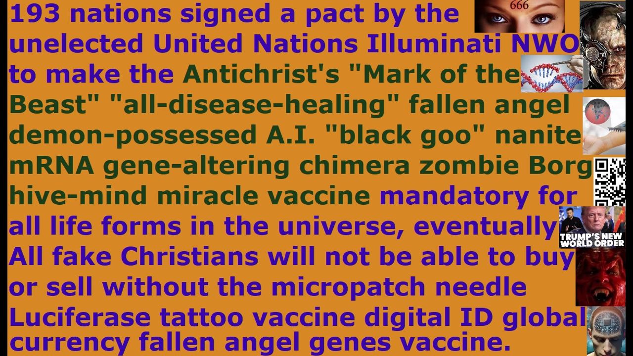 *** Intelligence news update from the Human Homo-Sapiens Race Survival Resistance (HRSR) headquarters and Republic Rebel Alliance battlefront (April 2025). 193 nations signed a pact by the unelected United Nations Illuminati NWO to make the Antichrist's "Mark of the Beast" "all-disease-healing" fallen angel demon-possessed A.I. "black goo" nanite mRNA gene-altering chimera zombie Borg hive-mind miracle vaccine mandatory for all life forms in the universe, eventually. All fake Christians will not be able to buy or sell without the micropatch needle Luciferase tattoo vaccine digital ID global currency fallen angel genes vaccine. Preach this in your next Sunday church service sermon, so that all your church member witch assassins will try to assassinate you and slaughter your genetic descendant idols, and 99% of your church donators will leave your church in disgust & anger & sheer terror, so that God’s house will be cleansed of their religious filth. Do it now and do not wait until tomorrow, unless you are a crazy lunatic who has lost all common sense of the Holy Spirit. Jesus died on the cross to atone for your sins, and he rose again, and he is seated on his throne in heaven reigning, so that whoever repents and receives him as Savior & Lord will receive forgiveness for sins and the gift of eternal life. Salvation is by free grace and faith in the atoning blood of Jesus, and not by wearing women's head coverings or abstaining from cross-dressing in men's pants or abstaining from extorting fake illegal tithe income tax. Repent and receive Jesus as Savior, and make straight the way of the Lord! End of transmission…