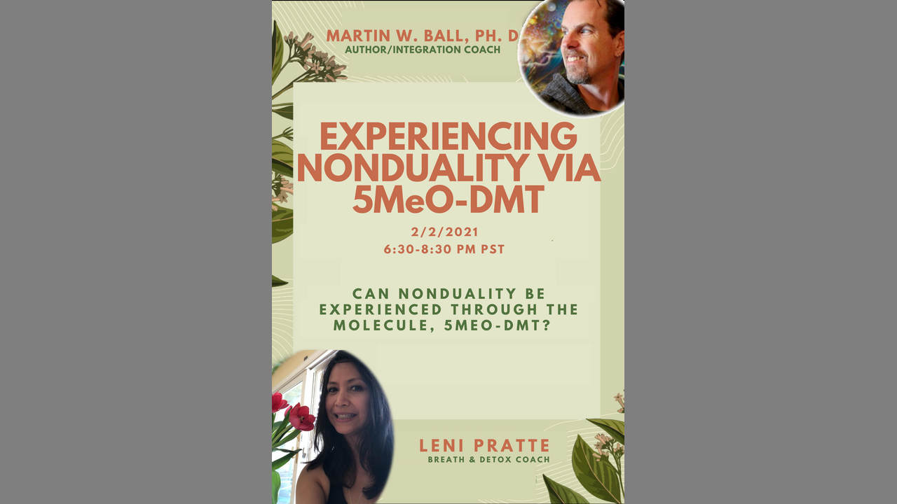 In this meeting, Martin W. Ball PhD, author of Entheogenic Liberation and professor of Religious Studies, will share his wisdom of the nondual state, from his many years of direct experience with 5MeO-DMT usage and facilitation.
