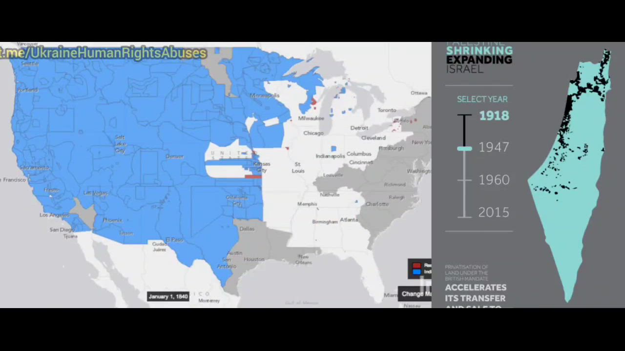Time-scale map of the loss of land of Native Americans and it's comparison to the lots of lost of land of the Palestinian people.