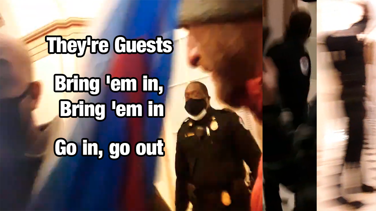 "There are three times when police gave instructions to the group and myself when I entered. The voice saying 'They're Guests' and the man saying 'Bring 'em in, Bring 'em in' have been matched as the same person, whom everyone there including police recognized as a high ranking capitol police officer. Also the capitol police officer checking for weapons who lays his hand on my shoulder and tells me 'Go in, go out' is all heard audibly on this video. This video has been public for 2 1/2 years on YouTube and is public information entered as evidence against me"