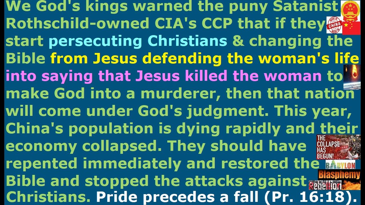 *** Intelligence news update from the Human Homo-Sapiens Race Survival Resistance (HRSR) headquarters and Republic Rebel Alliance battlefront (May 2025). We real Christians, who are God's kings & priests, warned the puny Satanist Rothschild family-owned CIA Al-Qaeda DHS ISIS terrorist agency's Chinese Communist Party (CCP) that if they start persecuting Christians and changing the Bible from “Jesus defending the woman's life” into saying that “Jesus killed the woman” to try to make God sound like a murderer, then that nation will come under God's judgment. This year, China's population is dying rapidly and their economy collapsed. They should have repented immediately, and restored the Bible, and stopped the attacks against Christians. Pride precedes a fall (Proverbs 16:18). Just like in the Western feminist nations where the millions of fake Christians are redefining hundreds of Bible verses to worship their hundreds of fake foreign gods, when a nation starts changing the Bible to blaspheme God and misrepresent him, that nation brings itself into God’s judgment. I preached and warned about this, as God’s kings & priests ruling & reigning over all the nations & governments & people & star systems & galactic empires & universal councils & all of God’s Creation to carry out God’s will & warnings & righteousness & love, but unlike Nineveh who repented, apparently China did not get the message just like Babylon did not repent of the “writings on the wall.” Therefore, the “writing on the wall” is announced to those nations, too, who have the audacity to rewrite God’s Word to misrepresent him and blaspheme him. The downfall of those nations have begun. God will shake the earth & the heavens. When God removes us who stand in the gap as intercessors, then that will be a declaration of war against the nations and the spiritual principalities who rule over those nations. It is a terrible thing to fall into the wrath of the Almighty God. King Jehoiakim took God’s daily sermons of warning by Jeremiah and burned it in the fire, and you know what happened to him and his pastors. I am eating dinner finally at 4:30 a.m. in the morning after making God’s daily sermon video, but no one seems to be listening or repenting or acting, just like in Noah’s days. They think God’s kings & priests are just nonsense blabbering idiots, who are risking starvation for nothing and for just fun. The world’s stupidity & evil has reached a peak. They trample over God’s love & warnings. Preach this in your next Sunday church service sermon, so that all your church member witch assassins will try to assassinate you and slaughter your genetic descendant idols, and 99% of your church donators will leave your church in disgust & anger & sheer terror, so that God’s house will be cleansed of their religious filth. Do it now and do not wait until tomorrow, unless you are a crazy lunatic who has lost all common sense of the Holy Spirit. Jesus died on the cross to atone for your sins, and he rose again, and he is seated on his throne in heaven reigning, so that whoever repents and receives him as Savior & Lord will receive forgiveness for sins and the gift of eternal life. Salvation is by free grace and faith in the atoning blood of Jesus, and not by wearing women's head coverings or abstaining from cross-dressing in men's pants or abstaining from extorting fake illegal tithe income tax. Repent and receive Jesus as Savior, and make straight the way of the Lord!