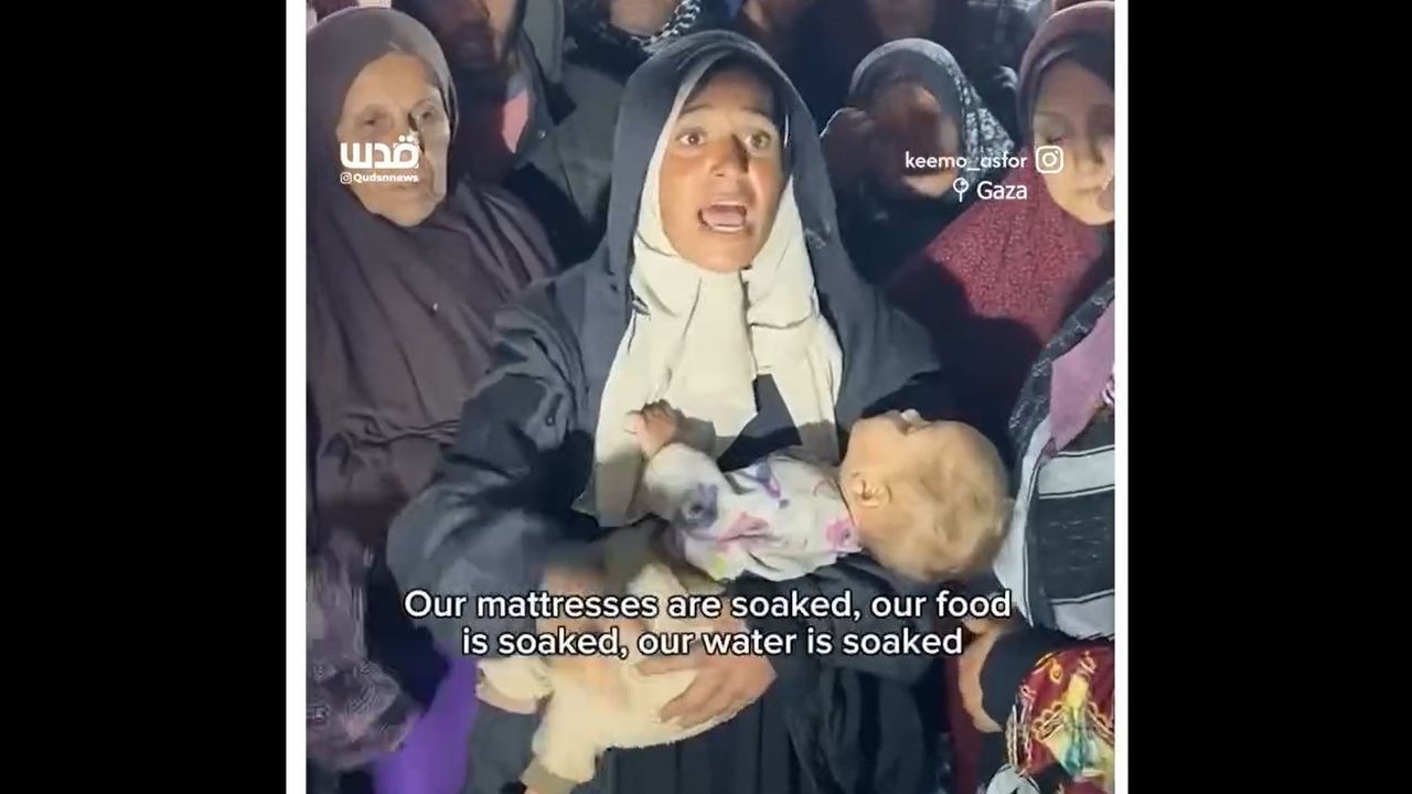 A Palestinian woman describes the inhumane conditions faced by tens of thousands of displaced civilians in makeshift tents due to the onset of the winter season and the lack of basic services across the Gaza Strip.