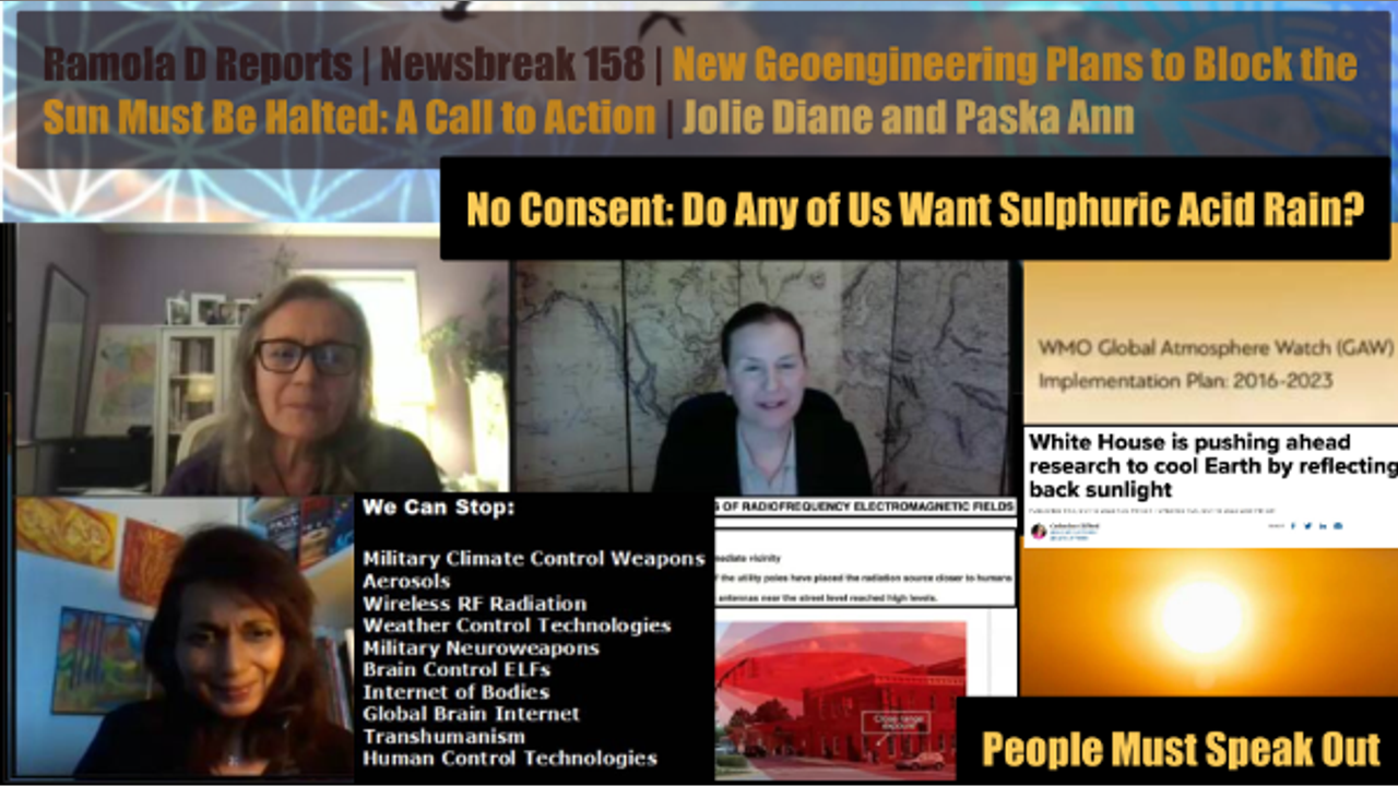 Educative and empowering conversation with Jolie Diane, Director of Zero Geoengineering and Zero 5G from New York and Paska Ann, Co-coordinator of the Connecticut State Assembly from Connecticut, on the dangers of blocking the sun with sulphur dioxide--as proposed by the Biden Administration and David Keith and co.--the long history of weaponized weather modification stemming from a history of military weather warfare, and the whole arc of climate control using ELFs, EMFs, and aerosols, all with dual-use intent. and where it's all headed, given the buildout of cyborging and technology-convergence technologies (nanotech, neurotech), the rollout of dangerously high frequencies of 5G and intended 6G, intentions for Brain Internet and Global Cerebral Internets, all of which also tie back to Michael Aquino's Satanic Mind Wars and James Giordano's published invasive neurotechnologies.