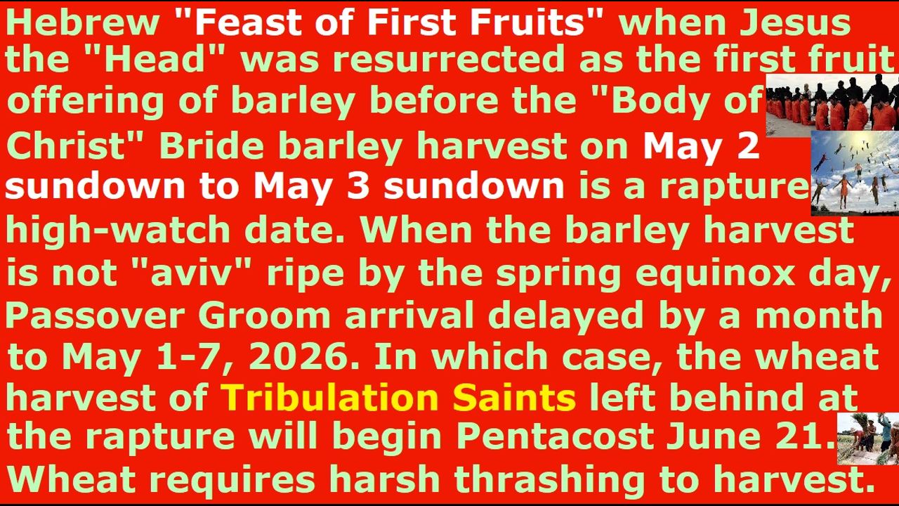 *** Intelligence news update from the Human Homo-Sapiens Race Survival Resistance (HRSR) and Republic Rebel Alliance battlefront (December 2025). The Hebrew "Feast of First Fruits" when Jesus the "Head" was resurrected as the first fruit offering of barley before the possible rapture resurrection of his small remnant of real Christian "Body of Christ" Bride barley harvest on the same day this year 2026 on May 2 sundown to May 3 sundown is a rapture high-watch date. Then, it would mean the “Head” and its “Body” would have the same resurrection rapture date on the “Feast of First Fruits,” which means the small remnant of Church Saints “Bride of Christ” are the First Fruit barley harvest offering along with Jesus who is their Head. When the barley harvest is not "aviv" ripe by the spring equinox day for the barley bread “omer” offering on Passover Pesach, the Passover Pesach Groom’s arrival is delayed by a month to the next full moon to May 1-7, 2026. In which case, the wheat harvest of the millions of cowardly traitor lukewarm Christian Tribulation Saints left behind at the rapture would begin on the wheat harvest Pentecost Shauvot on June 21, which also happens to be the summer solstice day exactly 50 days later, when the Church was birthed on Pentecost approximately 2,000 years ago. The numbers would fit perfectly. Wheat requires harsher threshing to harvest, so the lukewarm Christian Tribulation Saints will go through the Tribulation Age judgment to be purified of their sins by severe wheat threshing or thrashing persecutions by the Antichrist. If so, there would be a key difference between the rapture harvest of the Church Saints “Bride of Christ” barley harvest “Body of Christ” first fruits of the “Head” who is Christ, who may be resurrected on the Passover’s Feast of First Fruits barley harvest, compared to the martyred harvest of the Tribulation Saints lukewarm Christians wheat harvest, during the Shauvot Feast of Pentacost. Barley required less intensive threshing than wheat because its husk is less tightly bound to the grain. Both barley and wheat were generally threshed on the same open-air floors using similar methods, but the inherent characteristics of each grain dictated the necessary effort. The real Christian “Bride of Christ” have gone through assassination attempts every day, and loss of family & home & reputation & job & friends, and selling of all their possessions & using up of all their savings to reach the brink of starvation many times in order to defend the 6 billion humans and protect the millions of cowardly traitor fake Christians through the decades, which was their sanctification & purification process of Queen Esther’s bridal preparation, so that they are the five wise virgins with the Holy Spirit oil in their lamps. The millions of cowardly traitor lukewarm Christian “Tribulation Saints” five foolish virgins without oil in their lamps decided to ignore our real Christians’ daily sermons & warnings, and to betray us, and to run away in sheer terror of assassination attempts & fear of ridicule from all church donators, so they need to be purified by the Tribulation Age judgment’s tortures & rapes & cannibalism & beheading martyrdom by the Antichrist and his nephilim reptilian hybrid pedophile cannibal Satanist globalist elites. There is a difference in the harvest methods between the true Christian Church Saints “Bride of Christ” samurai warriors of Christ, who will be raptured to heaven before the Tribulation Age judgment of God versus the cowardly traitor lukewarm Christian Tribulation Saints, who will be martyred & killed by the Antichrist during the Tribulation Age judgment after they are left behind on the earth at the rapture. The Tribulation Age horrors & persecutions is the only way that the lukewarm Christian cowardly traitor Tribulation Saints can have their souls saved, so that they will not be thrown into hell.