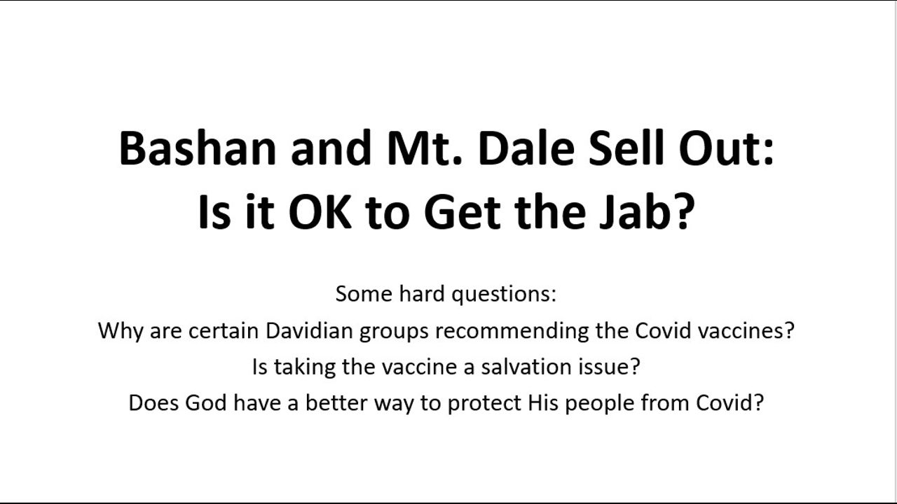 This presentation exposes the hypocrisy of Trevor Bingham and the Bashan Davidian Association for there stand promoting the Covid jabs contrary to the Bible and the counsels found in the Spirit of Prophecy (writings of Ellen White and V. T. Houteff).