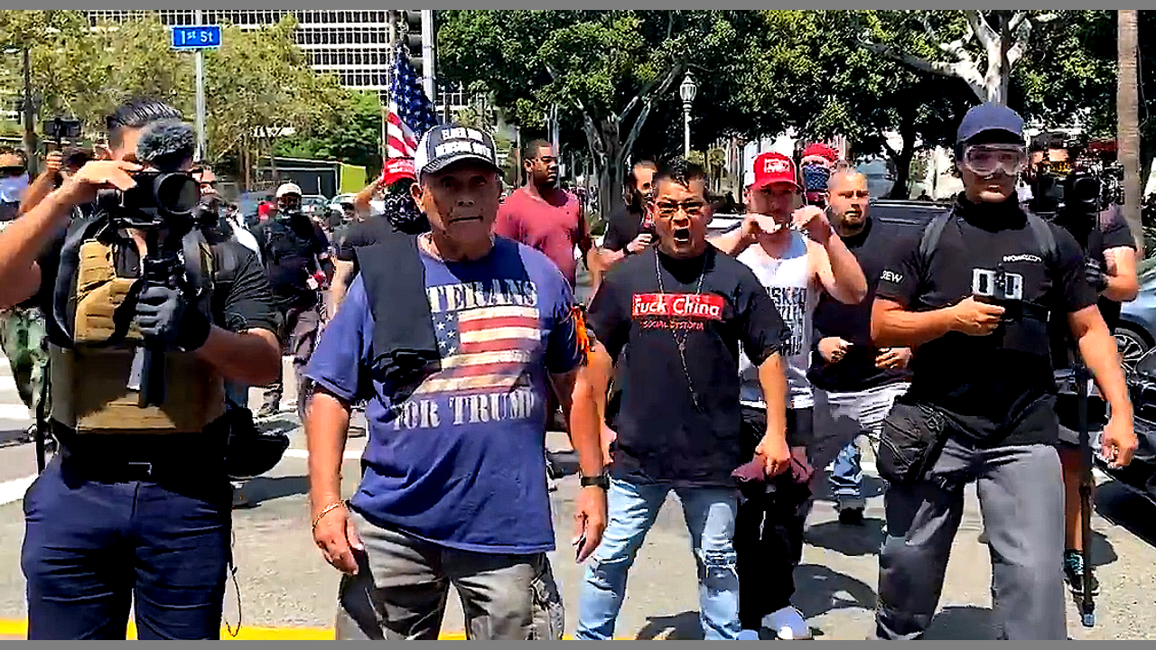 In front of City Hall in LA recall newsome crowd is counte.r demonstrated by many in black bloc, and the groups to begin to brawl. Antifa is heavily outnumbered as roof top Korean calls for those in bloc to be demasked. A conservative activist who calls himself Roof Korean can be seen in the footage demanding that the Antifa militants be unmasked.