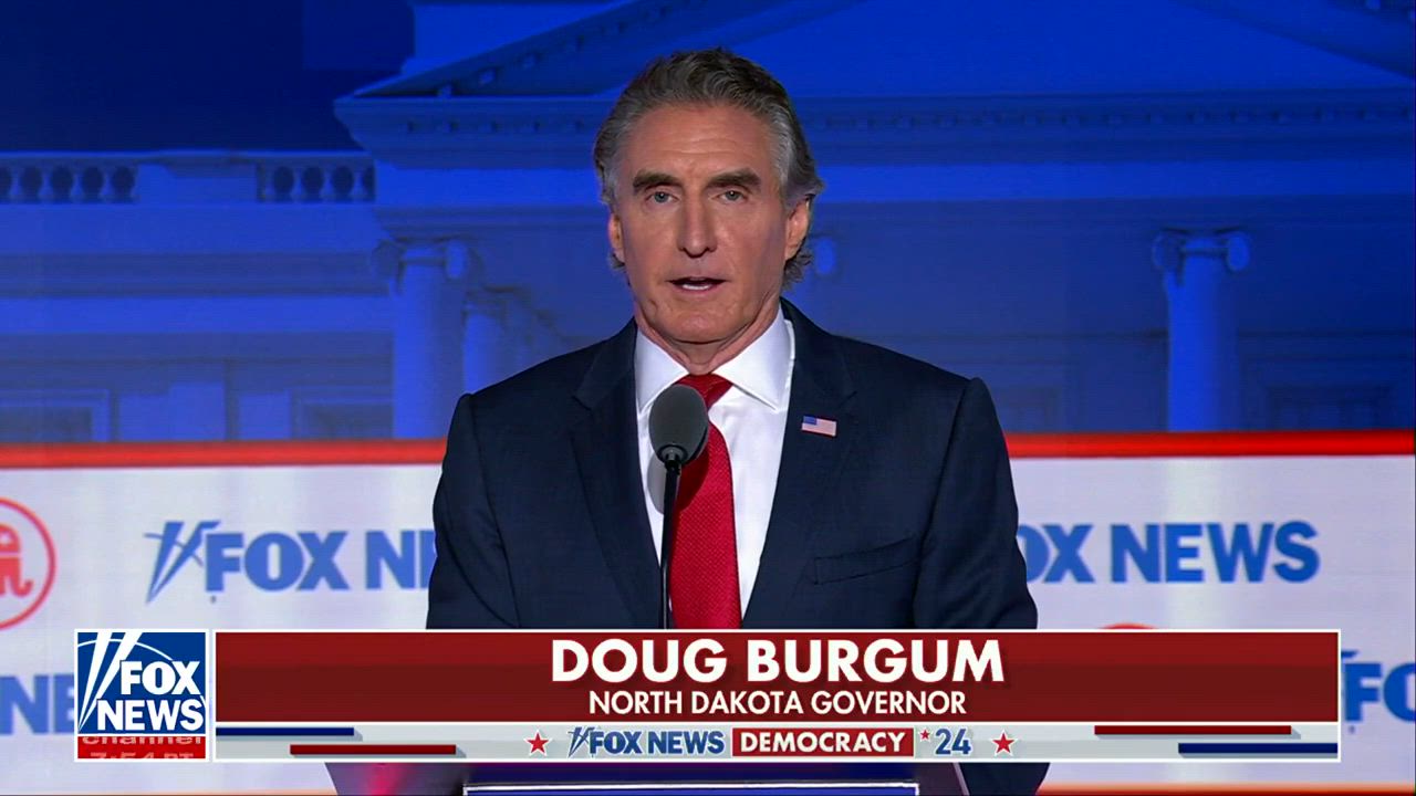 North Dakota Gov. Doug Burgum delivers his closing remarks during the first GOP primary republican debate on Fox News in Milwaukee, Wisconsin.