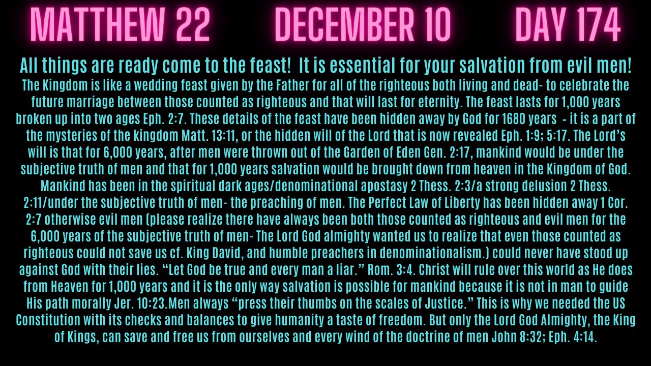 Matt 22. ITS READY! COME TO THE FEAST! THE ONLY PLACE ON EARTH WHERE YOU WILL BE SAFE AND FREE!