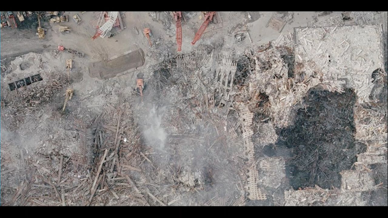 The clip starts with eyewitness testimony that the destruction of Tower 2 sounded like firecrackers going off. Next James takes you on a tour of the debris field.