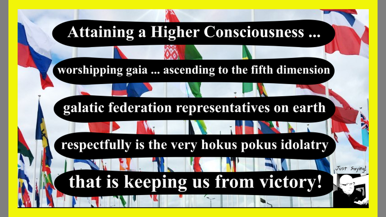 LOVING ALL JUDGING NONE AGREEING TO DISAGREE - ATTAINING A HIGHER CONSCIOUSNESS - WORSHIPPING GAIA - ASCENDING TO THE FIFTH DIMENTION - BEING A GALATIC FEDERATION REPRESENTATIVE ON EARTH - RESPECTFULLY IS THE VERY HOKUS POKUS IDOLATRY THAT IS KEEPING US (YOU) FROM VICTORY