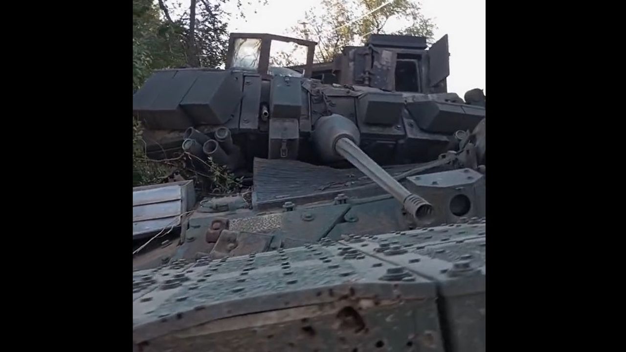 A completely burnt-out M2A2 Bradley ODS-SA infantry fighting vehicle with a BRAT remote sensing kit