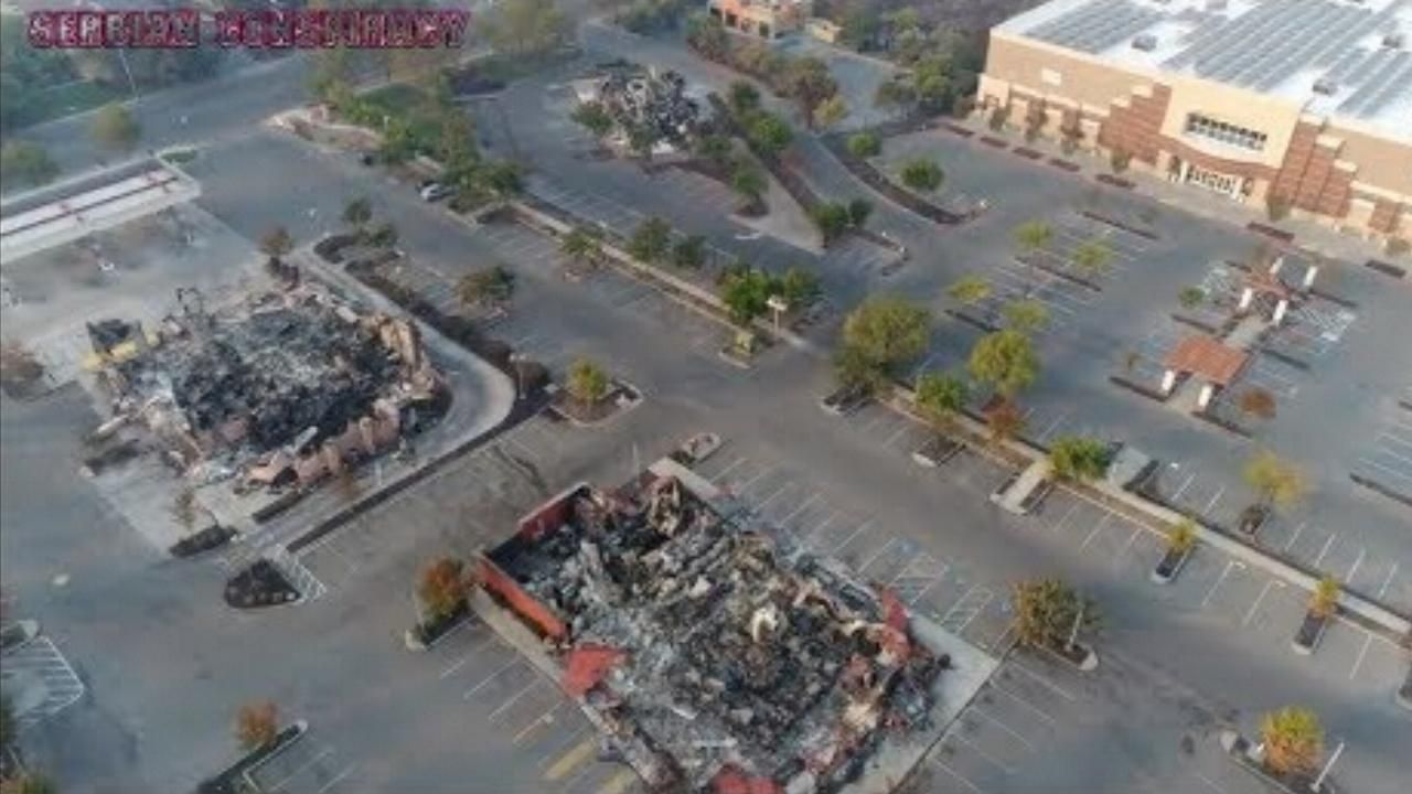 Drone footage over Santa Rosa and North California shows that only houses and cars burned, while Trees next to is not.