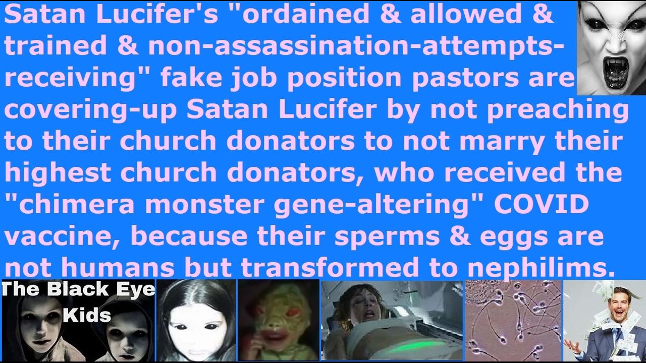 *** Intelligence news update from the Human Homo-Sapiens Race Survival Resistance (HRSR) headquarters and Republic Rebel Alliance battlefront (August 2023). Satan Lucifer's "ordained & allowed & trained & non-assassination-attempts-receiving" fake job position pastors are covering-up Satan Lucifer by not preaching to their church donators to not marry their highest church donators, who received the "chimera monster gene-altering" COVID vaccine, because their sperms & eggs are not humans but they are transformed to nephilim vampires. Tell Satan Lucifer's "ordained & allowed & trained & non-assassination-attempts-receiving" fake unbiblical job position church pastors to warn all their church donators not to marry their highest church donators and their relatives, who received the COVID & Rubella biochemical weapon vaccines, because the fallen angels "fake ascended masters fake aliens" vampire devils are changing God's human specie into a psychic powers witch shape-shifting “children's adrenochrome blood-drinking” nephilim race. Just like Nehemiah in the Bible warned pastors and church members against breeding hybrids, I told pastors to warn their church donators that the Noah's days Atlantis New Age Wicca witch "Sirens" married the fallen angels and became accursed, and they eat thousands of men they seduce in their New Orleans witchcraft city’s brothels and convents, but the cold-blooded evil cowardly traitor money-mongering pastors refuse to warn their church donators to stop marrying the fallen angel incarnate avatars to breed nephilim hybrids in the churches, and to warn God's spiritual army now about these New Orleans vampires and that the COVID vaccinated biggest church donators’ and their relatives’ sperms and eggs are now nephilim vampire hybrid shape-shifting chimera monsters, so that the blood of millions of people are on their hands and they are guilty of corrupting the entire human specie. The shapeshifting “black eye children,” who are being born to these COVID biochemical weapon vaccine vaccinated people, have all shapeshifting black eyes and are able to talk immediately and have teeth and can walk and levitate and have supernatural abilities. Warn all your church donators and 6 billion people and everyone you see that all your highest paying church donators and their relatives and families, who received the COVID or Rubella biochemical weapon vaccines, have sperms and eggs that have been converted to nephilim vampire black-eye-children chimera monsters offspring of the fallen angel vampires, so to not marry them. Tell the pastors and fake Christians that if they do not warn all their church donators and 6 billion humans, then their blood is on their hands, as well as the blood of all their offspring and descendants down to the millionth generations. They will be guilty of genocide like Mao Tse Tung and Pol Pot and Stalin and Hitler and other Satanist Draco reptilian chimera fake alien incarnate avatar globalist elites. Speak forth the 100% truth, even if everyone comes to try to kill you, and cook you alive with CIA microwave oven weapons from next door homes & rooms, and all your church donators ridicule you as a lunatic heretic idiotic narcotic maniac, and all your church donators will form mob riots to try to stone you and crucify you and rip your collar off. It is your duty as God’s “Bible’s watchman on the wall.” Love others before your own survival, even if they are shooting you with FBI pinpoint heart attack EMF weapons, and sending demons to try to SIDS kill you every day, and all your income is cut off for imminent starvation, and all your church donators will hate your guts with a passion. God’s Word says, “A new command I give you: Love one another. As I have loved you, so you must love one another. By this everyone will know that you are my disciples, if you love one another.”