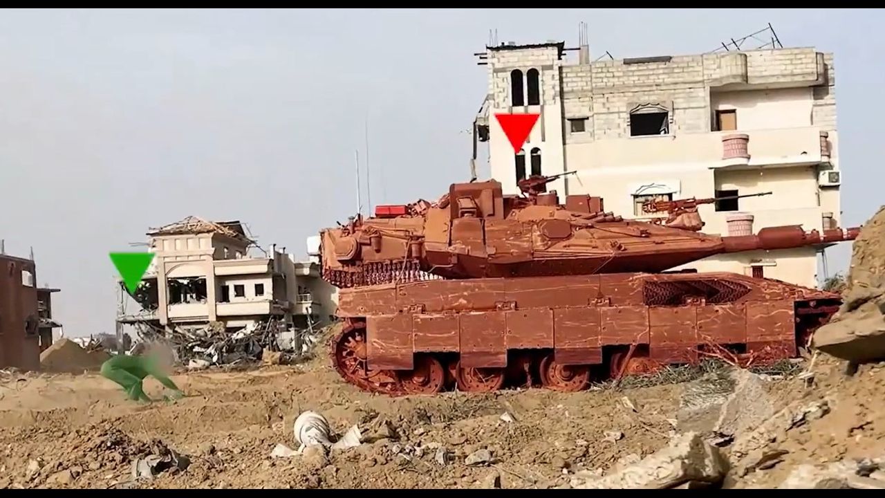 The Palestinian fighter runs behind an Israeli tank, places what looks to be a shaped charge IED, and runs back to cover.