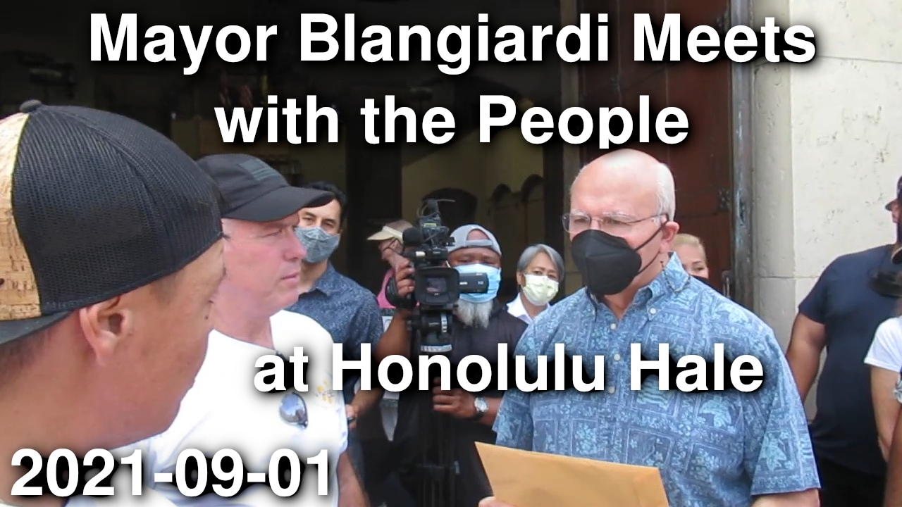 On September 1, 2021 dozens of the people of Hawaii assembled at Honolulu Hale and requested to speak with Mayor Blangiardi concerning mandates and some of his recent statements about "mandatory vaccinations". Blangiardi came out and spoke with the people for about an hour and agreed to schedule a town hall meeting again soon.