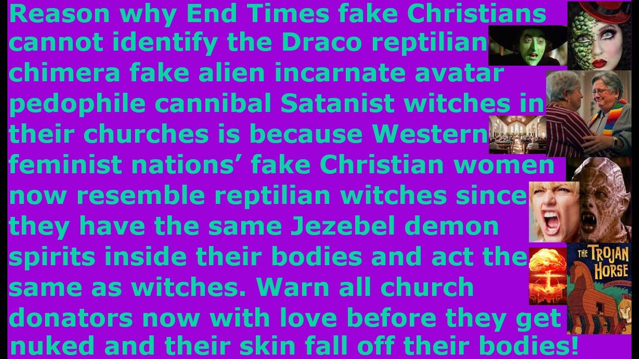 *** Intelligence news update from the Human Homo-Sapiens Race Survival Resistance (HRSR) headquarters and Republic Rebel Alliance battlefront (December 2024). Reason why End Times fake Christians cannot identify the Draco reptilian chimera fake alien incarnate avatar pedophile cannibal Satanist witches in their churches is because Western feminist nations’ fake Christian women now resemble reptilian witches since they have the same Jezebel demon spirits inside their bodies and act the same as witches. Warn all church donators now before they get nuked and their skin fall off their bodies! The reason why the millions of Western feminist nations’ post-1960s Sananda Jesus’ End Times “2 Timothy 3:2-5” apostate harlot churches’ “Bible verses redefining, uncovered women’s heads, fallen angel head controlled rebels” “Satan Lucifer’s post-1960s cross-dress-project men’s pants cross-dressers androgynous transgender God’s-Word-mockers” fake Christians cannot identify immediately the millions of Draco reptilian chimera fake alien incarnate avatar pedophile cannibal Satanist church member witch assassins inside their churches, who are putting their 12 million kidnapped Western feminist nations’ children’s human meat & bone ashes into their church food, is because the millions of Western feminist nations’ fake Christian women now resemble identically the reptilian witches, since they have the same reptilian Jezebel demon spirit inside their bodies from very young ages, and they act the same as the reptilian witches, and they think like the reptilian witches, and have the same values as the reptilian witches, and they dress identical to the reptilian witches. If you have one rotten apple inside a crate, then it is easy to identify it, but if you have a crate that is all rotten apples, you cannot tell which one is the forbidden fruit, because they all look & smell the same. They all have stench, and they all corrupt the family & society with their thinking, and they all redefine hundreds of Bible verses for their hundreds of fake foreign gods, and they all remove God’s spiritual protection, and they all bring back millions of fallen angels and nephilim dead disembodied demon spirit raphaim from the abyss to take over their governments & churches & schools & media & corporations & military & courts & police to exterminate them just as in Noah’s days. If you had a real Church of our Almighty Holy Righteous Loving Creator God YHWH Jesus, who have the Holy Spirit of God, you would be able to tell immediately when a witch tries to infiltrate a church, because they behave like reptilian women and not like human specie women. A reptilian spirit and God’s Holy Spirit are extreme opposite spirits. Satan Lucifer does not work instantly, but he corrupts usually the women who is the weaker mind or Eve first over a very long period of time, so that the corruption cannot be detected from generation to generation, until you have an End Times most wicked vile disgusting stinking generation on earth that resembles the generation in Noah’s days who were raped & eaten by the nephilims. This is why millions of Western feminist nations’ women and 12 million children are being raped & eaten by the nephilims, and the millions of fake Christians are not exposing it to the 6 billion humans as “watchmen on the wall,” but they are hiding it for fear of assassination attempts and ridicule from their church donators, and condoning it in silence, and even worse, they are eating their own children in their church member witch assassins’ church food and watching other church donators eat their children without warning them. They are worse than the Israelites during the siege, who ate their children, because they watch others eat their children, too. This is what the Western feminist nations’ churches have come, too. They resemble the reptilian witches in cowardice and traitor mentalities, too.