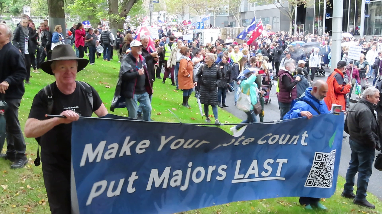 This Saturday protest was a special day called "Millions March" where a super effort all over Australia was made to show our corrupt Federal Government our protest strength in numbers. It was drizzling in Melbourne but there was still a significant increase in protest crowd size. We walked from Parliament House, stopped at the Bourke Street Police Station to serenade them and then on to Flagstaff Gardens. At the Gardens there was clear confusion when a breakaway faction of the protest leaders led the march further down the road, a third walked into the Gardens to hear speeches and songs and another third walked further on while the remainder stood confused wondering which group to follow. To put it mildly it was pretty disappointing. This was meant to be a clear signal to the Federal Government with one week to go before the Federal Election, to convince people to "Put the Majors (Major Parties) Last".