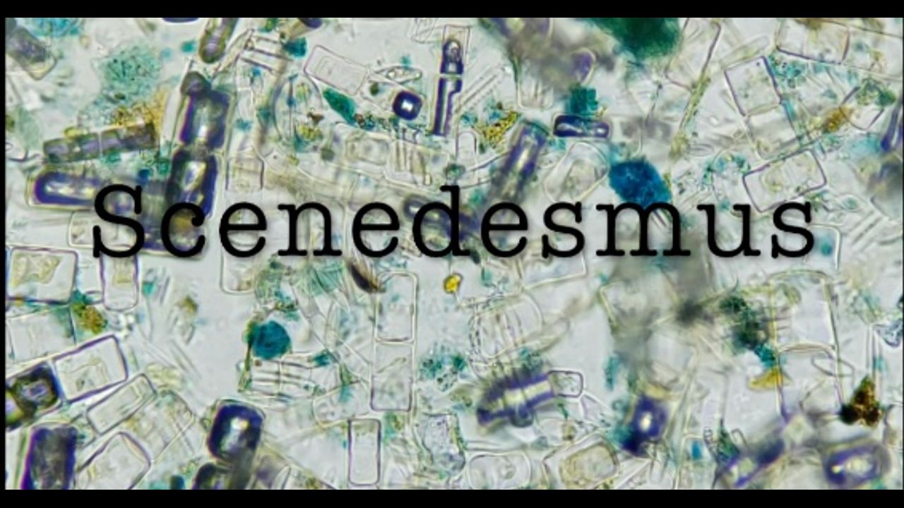 This slide is labeled "Scenedesmus quadricauda," and it was made in Japan. This sample isn't clear as to what parts are the Scenedesmus. It looks like a mix of different things.