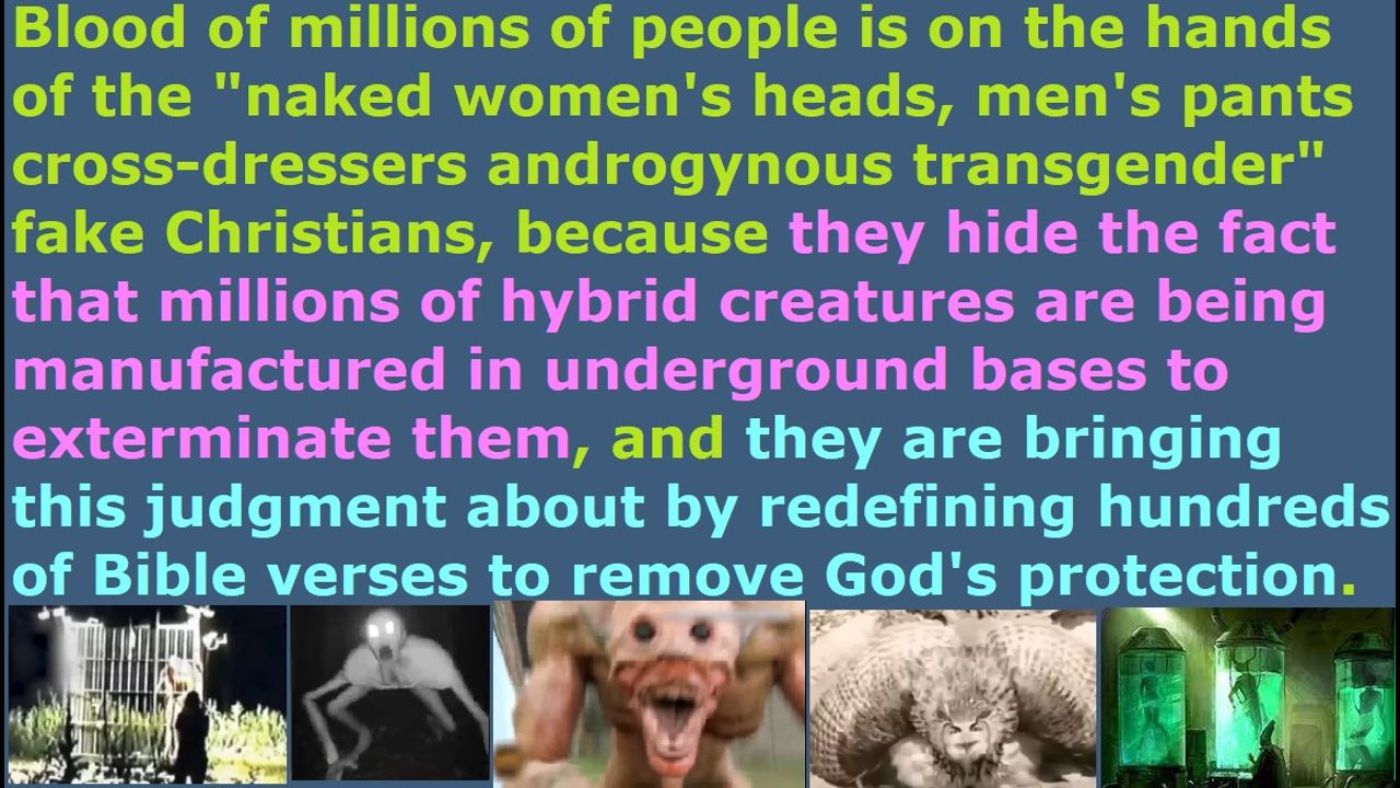 *** Intelligence news update from the Human Homo-Sapiens Race Survival Resistance (HRSR) headquarters and Republic Rebel Alliance battlefront (January 2024). Blood of millions of people is on the hands of the "naked women's heads, men's pants cross-dressers androgynous transgender” fake Christians, because they hide the fact that millions of hybrid creatures are being manufactured in underground bases to exterminate them, and they are bringing this judgment about by redefining hundreds of Bible verses to remove God's protection. Preach this in your next Sunday church service sermon, so that 99% of your church donators will leave your church in anger & terror & disgust, so that God’s house will be cleansed of their religious filth. Do it now and do not wait until tomorrow, unless you are a crazy lunatic who has lost all common sense of the Holy Spirit. Jesus died on the cross to atone for your sins, and he rose again, and he is seated on his throne in heaven reigning, so that whoever repents and receives him as Savior & Lord will receive forgiveness for sins and the gift of eternal life. Salvation is by free grace and faith in the atoning blood of Jesus, and not by wearing women's head coverings or abstaining from cross-dressing in men's pants or abstaining from extorting fake illegal tithe income tax. Repent and receive Jesus as Savior, and make straight the way of the Lord! End of transmission…