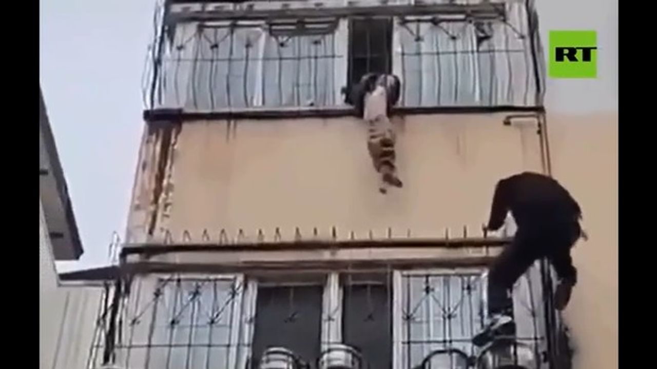 The man scaled four stories without safety gear to rescue a child who was stuck and dangling from a balcony