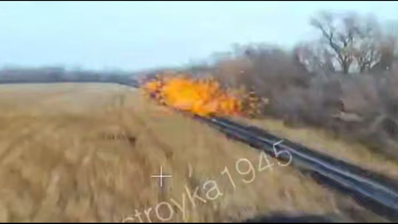 The moment of the Lancet strike on the M1126 Stryker armored personnel carrier, captured by the lens of the nearby FPV drone "Prince Vandal Novgorodsky", Kursk region.